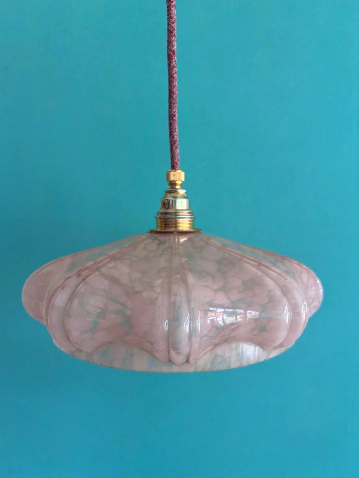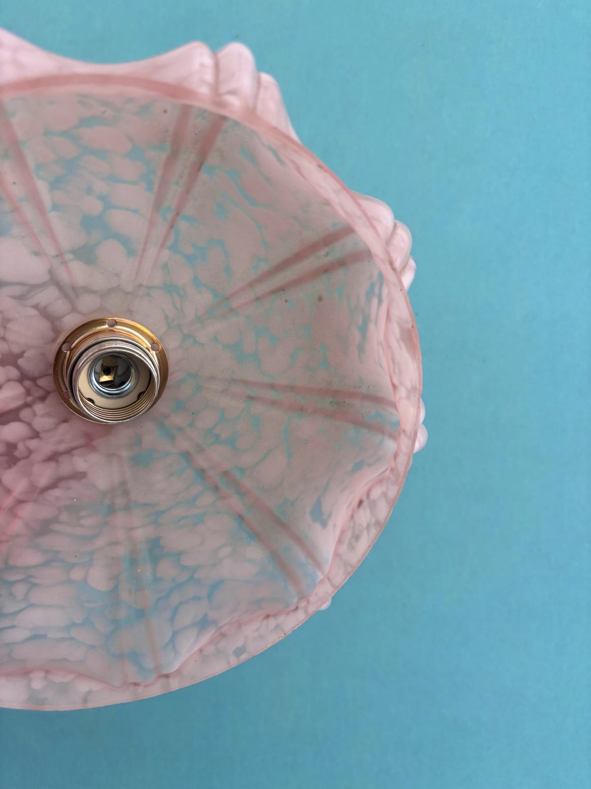 Vintage Frans Clichy lampje van roze glas. Een delicate eyecatcher met warme, romantische sfeer.