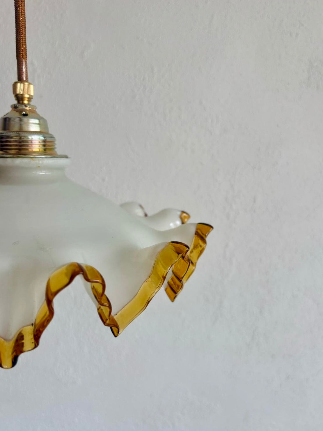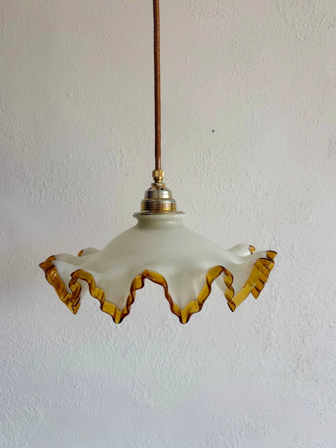 Pingado is pure Franse charme. Het melkglas met amberkleurige, golvende rand vangt het licht zacht en warm, precies genoeg om sfeer te creëren zonder te overheersen. Elegant, speels en tijdloos – een echte blikvanger boven de eettafel, in de hal of slaapkamer.