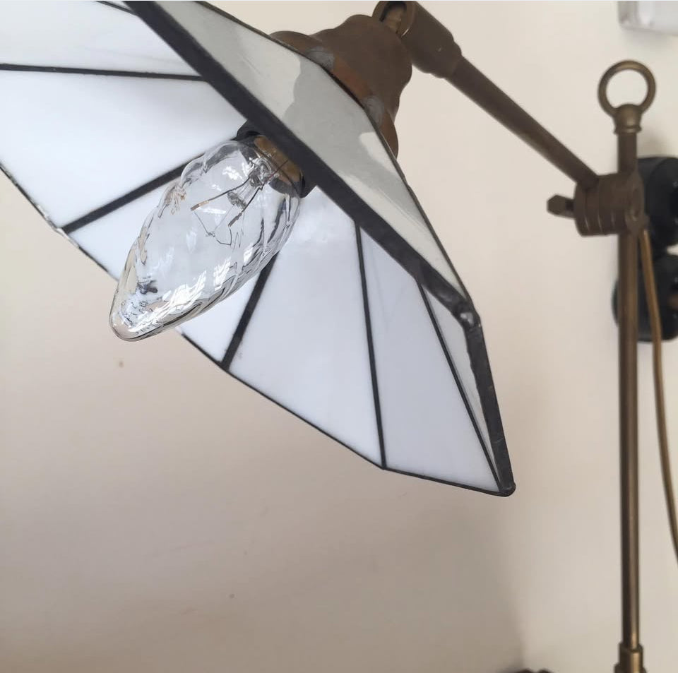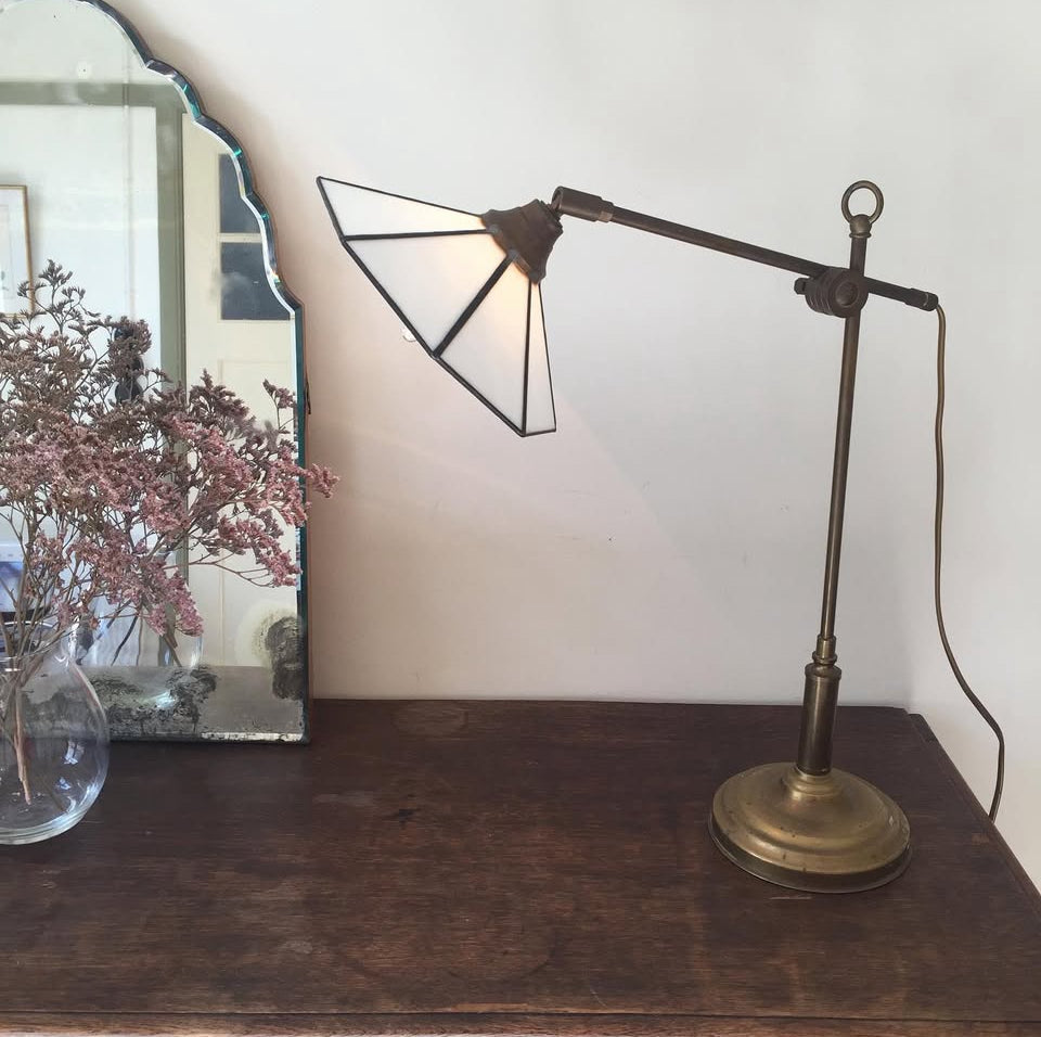 Deze karaktervolle vintage Art Deco bureaulamp heeft een stevige voet van messing en een verstelbare arm en kap, zodat je het licht makkelijk kunt richten waar je het nodig hebt. De opvallende glazen kap met geometrisch patroon in Tiffany stijl geeft de lamp een stijlvolle, tijdloze uitstraling. Ideaal voor op het bureau of de werktafel, maar ook mooi als sfeervolle blikvanger in een klassiek of industrieel interieur.